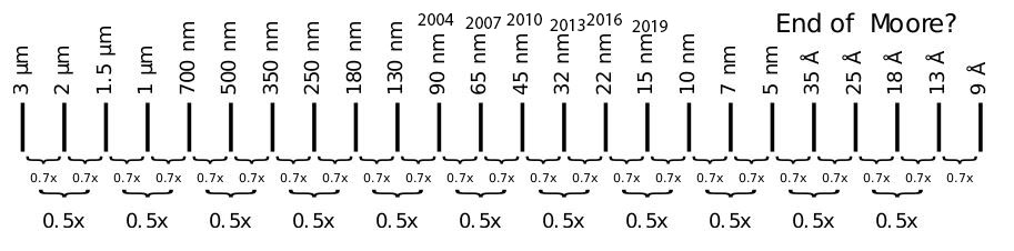 There is a rule developed by Gordon Moore that projected the increase of density of semiconductors. For many years the path “Moore’s Law” predicted (a doubling of density roughly every 18 months) has been followed. The driver for this pattern was increased computing power for more and more complex operations. For a number of years, the decreasing size was identified by the node, which is based on the smallest half-pitch. (The half-pitch is one half of the minimum spacing between adjacent smallest metal lines.) In the 1990s, the node designation changed from the minimum spacing due to technology challenges. [Cf. Bill Arnold’s article for a in depth presentation. Ref. #1].